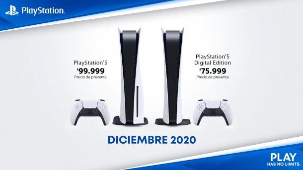 La PlayStation 5 con unidad de disco Blu-ray Ultra HD a un precio sugerido de preventa de 99.999 pesos, en tanto que la versión digital costará 75.999 pesos. El control Dual Sense estará en 9.299 pesos.