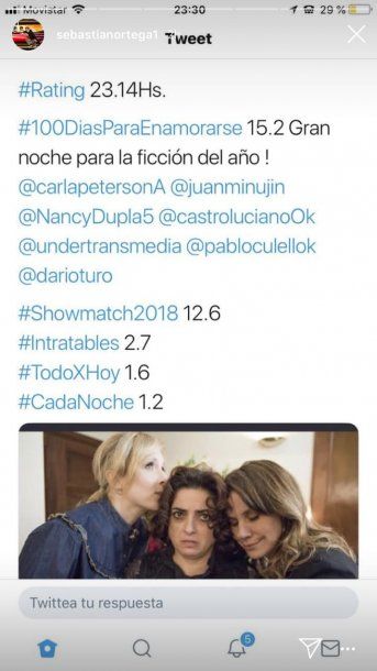 Para festejarlo, Ortega no tuvo mejor idea que compartir en sus historias de Instagram una polémica foto de Tinelli colgado en la bola de espejos junto a un emoji riéndose. La foto continua era la que demostraba la diferencia de ratings con un agregado: “Gran noche para la ficción del año”.