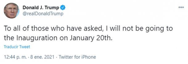 El presidente saliente de Estados Unidos, Donald Trump, anunció que no asistirá el 20 de enero a la ceremonia de investidura de su sucesor en el cargo, el demócrata Joe Biden.
