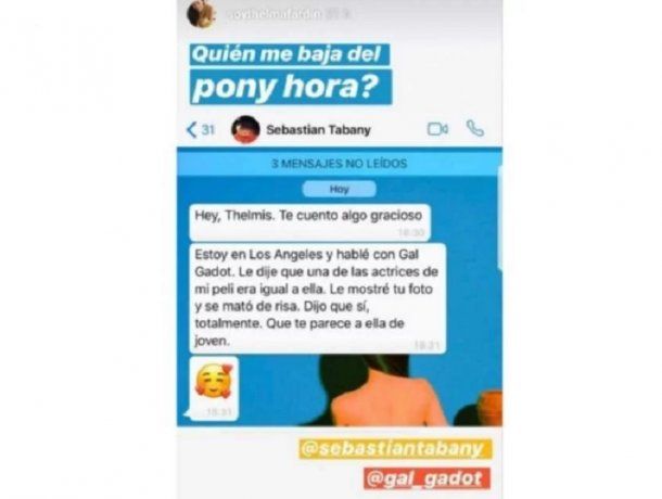La artista argentina de 27 años, que se encuentra actualmente en Mar del Plata realizando la obra “Fuera de Línea”, difundió una captura de pantalla de WhatsApp con Tabany donde en principio se puede leer: «Hola, Thelmis. Te cuento algo gracioso. Estoy en Los Ángeles y hablé con Gal Gadot«.