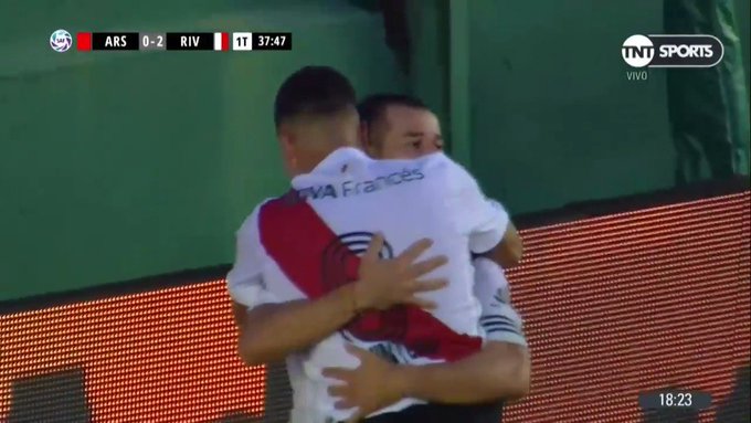 #TNTSports | Gran contra de River entre Mora y Quintero que definió el colombiano con el arco libre. Tercero de River que derrota 3-0 a Arsenal.