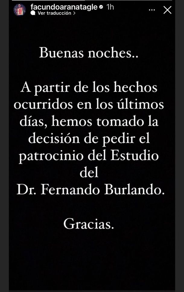 Horas después, el actor informó en su cuenta de Instagram que demandará a la actriz. «A partir de los hechos ocurridos en los últimod días, hemos tomado la decisión de pedir el patrocinio del estudio del Dr. Fernando Burlando. Gracias«, aseguró en una historia de Instagram.