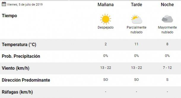 El SMN pronosticó un viernes con temperaturas mínimas que irán desde los 2° y por la tarde llegará a 11°. La térmica podría llegar a los 0° sobre todo la mañana. El día estará despejado y no se esperan lluvias.