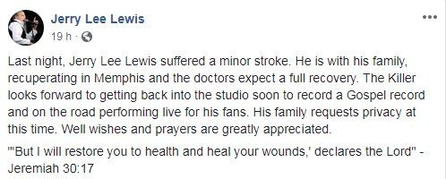 “The Killer espera volver al estudio para grabar un disco de Gospel y actuar en vivo para sus fanáticos. Su familia solicita privacidad en este momento. Buenos deseos y oraciones son muy apreciados”, escribieron en el perfil del músico en Facebook.