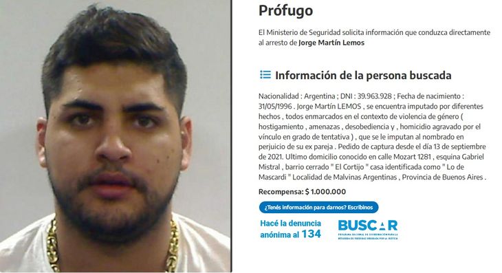 El ministerio de Seguridad publicó los datos personales del prófugo y ofreció un millón de pesos de recompensa por información que conduzca directamente al arresto de Jorge Martín Lemos.