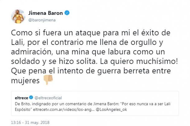 Al hacerse eco de sus dichos, Barón lanzó un tuit contra De Brito: “Como si fuera un ataque para mí el éxito de Lali, por el contrario me llena de orgullo y admiración, una mina que labura como un soldado y se hizo solita. ¡La quiero muchísimo! Qué pena el intento de guerra berreta entre mujeres”.