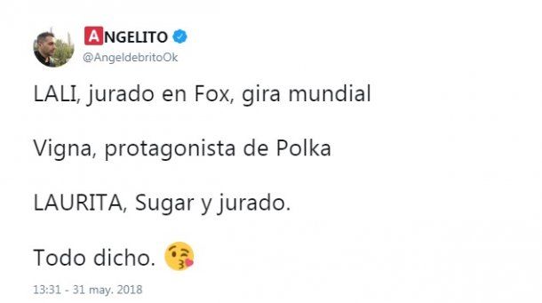 Sin vueltas y por la misma red social, el conductor publicó una especie de “podio” en el que incluyó a Lali, Flor Vigna y Laurita Fernández como sinónimos de “exitosas”: “LALI, jurado en Fox, gira mundial; Vigna, protagonista de Polka; LAURITA, Sugar y jurado. Todo dicho”, respondió.