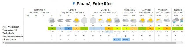 Este lunes se pronostica una mínima de 4° y una máxima de 20° en la capital entrerriana y departamentos de la costa del Paraná y del centro. El día comenzará con neblina y continuará con el cielo algo nublado.