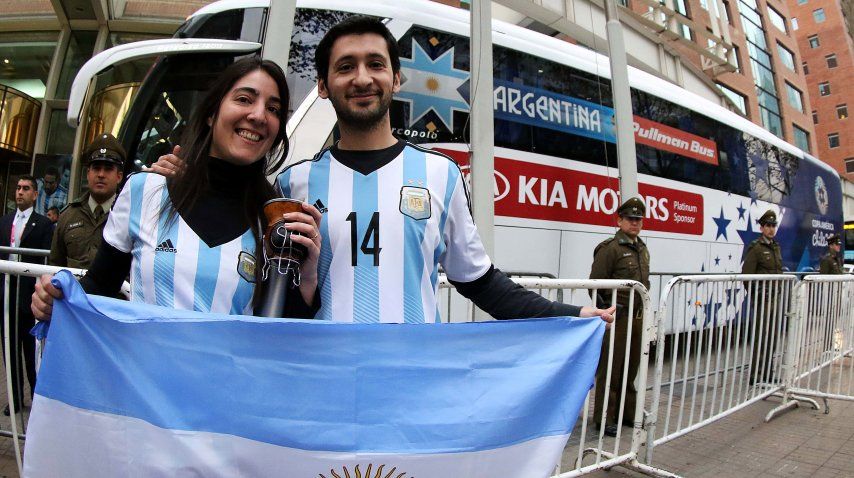Cuando los simpatizantes locales identificaron el micro sobre la avenidaVitacura comenzaron a agitar banderas chilenas desde las oficinas y tocar bocinas desde sus vehículos, suscitando un tranquilo contrapunto con los argentinos, todo detrás de un doble vallado de carabineros que impedía el contacto con la gente.